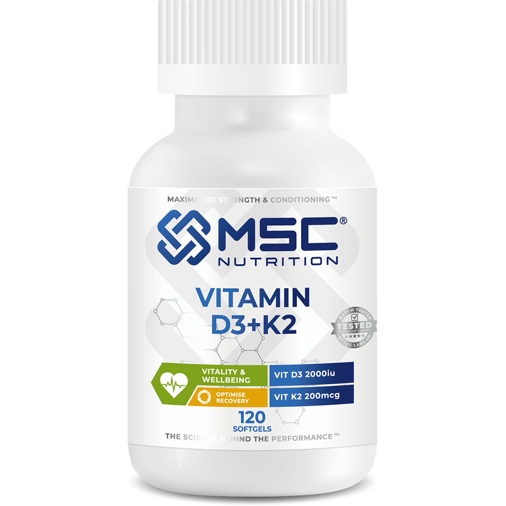 MSC Nutrition Vitamin D3 & K2 Soft gels are packed with 2000iu of Vitamin D and 200mcg of Vitamin K2 per soft gel. Both Vitamin D3 and K2 are essential for the absorption and maintenance of normal blood concentrations of Calcium, which is vital for healthy teeth and bones.